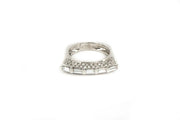 18K White Gold stylized dome ring, mounted with a row of gem lock set baguette Diamonds and decorated with pave-set diamonds