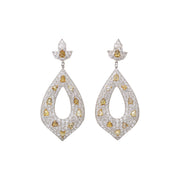 Hippie Chic 18K white gold stylized tulip studs, cupping the lower earlobe, suspending pearshaped ear pendants decorated with pave'-set round rose-cut diamonds: 8.99 carats, with natural fancy yellow color rose-cut pear-shaped diamond studs: 4.00 carats.