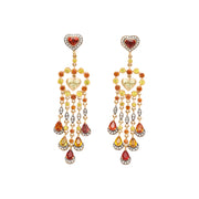 18K Rose Gold chandelier earrings, mounted with heart-shaped, Spessertite, Scapolite, Sapphires, and Diamonds