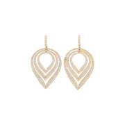 18K Yellow Gold semi-hoop earrings suspending articulating inverted concentric pear-shape pendants decorated entirely with colorless pave'-set round brilliant-cut diamonds