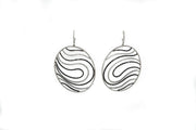 18K White Gold earrings, suspending stylized rings, decorated with micro-melee'-set round black and white diamonds and a black rhodium wash