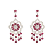 Platinum chandelier earrings mounted with round, Brilliant-cut Rubies and decorated with round, Brilliant-cut Diamonds