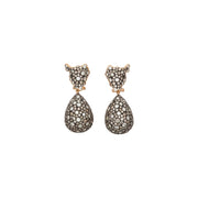Bohemian chic 18K rose gold stylized ear pendants configured with a scalloped cone-shaped ear component suspending a voluminous pear-shape drop (with a filigree finish on the flip side), decorated entirely with pave'-set, round brilliant-cut natural multi-color earth-tone diamonds, with a final wash in black rhodium bath for a high impact POP burst of autumn colors!