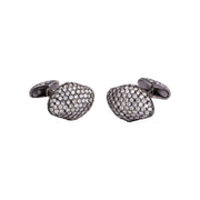 For a Gentleman's formal affair, 18K white gold free-form lozenge-shaped cuff-links and 4 matching button-studs decorated with round brilliant-cut colorless diamonds on the top, and round black diamonds on the underside, finished with oxidized rhodium wash for the final POP! Cuff-links have a pivotal T-bar for easy insertion thru French shirt cuffs; button studs are mounted on spring posts for easy insertion thru button slits.