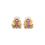 Gently articulating 18K Rose Gold stylized Egyptian scarab earrings mounted with cabochon pink tourmaline body, decorated with pave-set round brilliant-cut diamond, yellow sapphire, pink sapphire, golden topaz, and blue zircon. These earrings are fabricated with large omega clips and posts to be worn on pierced ears only.