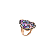 Hippie chic, pear-shaped motif mounted on 18K yellow gold ring decorated with oval shape pink sapphire, blue sapphire, and amethyst - decorated with a paveÕ-set round brilliant-cut diamond trim and an extreme outer trim of black diamonds. Finished with a black rhodium wash for the POP color impact.